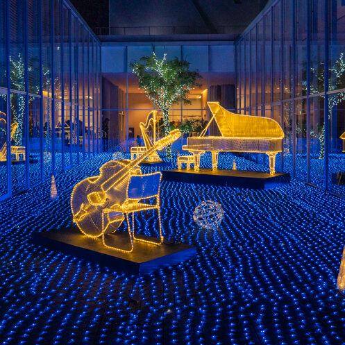 中庭には光輝くピアノ、ハープ、コントラバスのオブジェも。