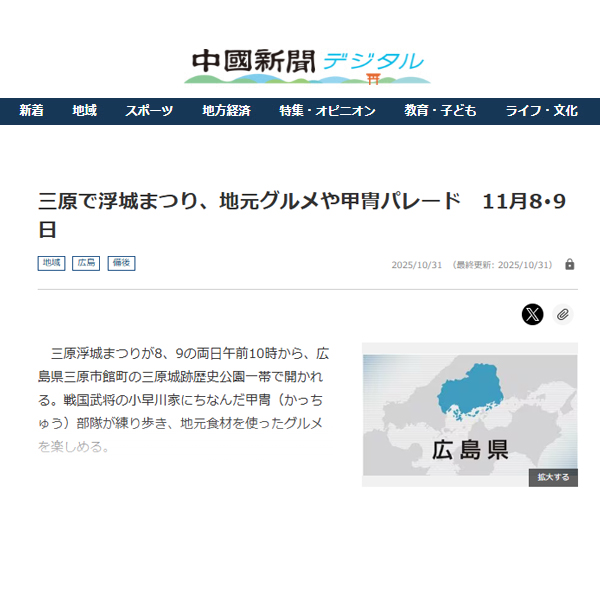 【中国新聞】三原で浮城まつり、地元グルメや甲冑パレード 11月8・9日(^O^)/ 2025年11月03日更新 クリック>【中国新聞】三原で浮城まつり、地元グルメや甲冑パレード 11月8・9日(^O^)/ 更新日:2025年9月26日更新 三原浮城まつりが8、9の両日午前10時から、広島県三原市館町の三原城跡歴史公園一帯で開かれる。戦国武将の小早川家にちなんだ甲冑(かっちゅう)部隊が練り歩き、地元食材を使ったグルメを楽しめる。 Tweet 前の記事→【西原建設】リフォームフェスタ開催中!!(^O^)/ 一覧へもどる