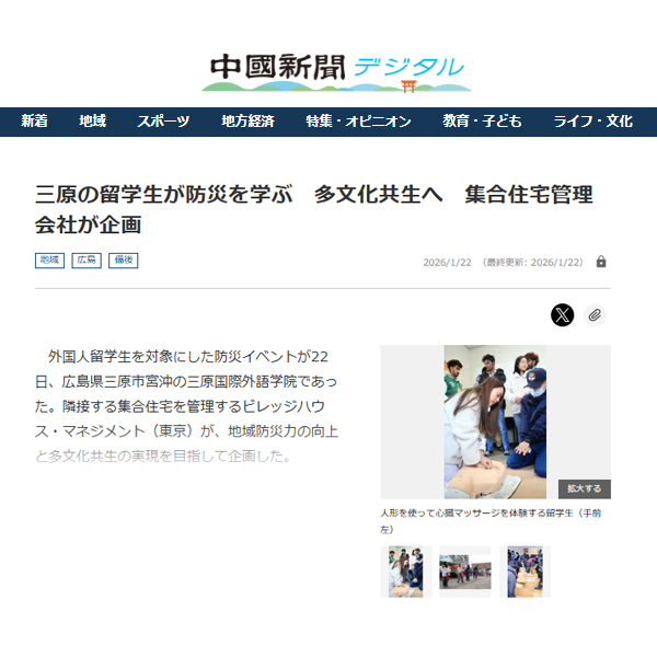 【中国新聞】三原の留学生が防災を学ぶ 多文化共生へ 集合住宅管理会社が企画(^O^)/ 2026年2月01日更新 クリック>【中国新聞】三原の留学生が防災を学ぶ 多文化共生へ 集合住宅管理会社が企画(^O^)/ 更新日:2026年1月22日更新 外国人留学生を対象にした防災イベントが22日、広島県三原市宮沖の三原国際外語学院であった。隣接する集合住宅を管理するビレッジハウス・マネジメント(東京)が、地域防災力の向上と多文化共生の実現を目指して企画した。 Tweet 前の記事→【三原市デジタル化戦略課】災害や緊急事態に備えて、ラジオを準備しておきましょう! 一覧へもどる