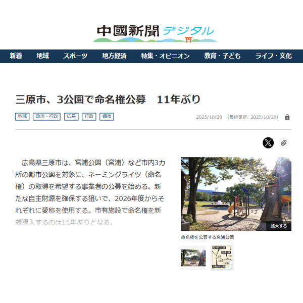 広島県三原市は、宮浦公園(宮浦)など市内3カ所の都市公園を対象に、ネーミングライツ(命名権)の取得を希望する事業者の公募を始める。新たな自主財源を確保する狙いで、2026年度からそれぞれに愛称を使用する。市有施設で命名権を新規導入するのは11年ぶりとなる。