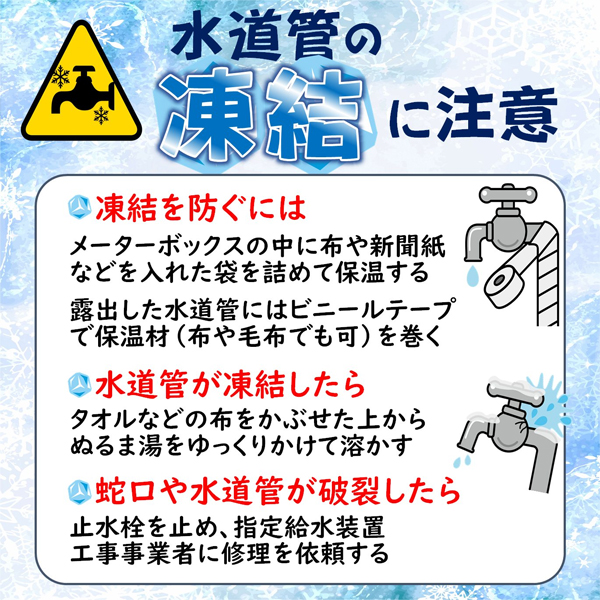気温が急激に下がると、水道管が凍結して水が出なくなったり、水道管が破裂したりする恐れがあります。