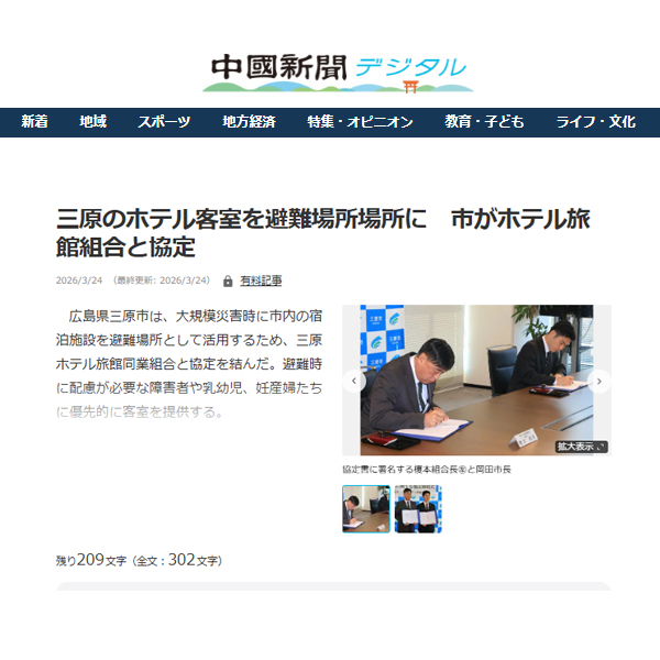 【中国新聞】三原のホテル客室を避難場所場所に 市がホテル旅館組合と協定(^O^)/ 2026年4月07日更新 クリック>【中国新聞】三原のホテル客室を避難場所場所に 市がホテル旅館組合と協定(^O^)/ 更新日:2026年3月24日更新 広島県三原市は、大規模災害時に市内の宿泊施設を避難場所として活用するため、三原ホテル旅館同業組合と協定を結んだ。避難時に配慮が必要な障害者や乳幼児、妊産婦たちに優先的に客室を提供する。 Tweet 前の記事→【広島県】新1年生の子ども達が交通ルールに慣れていないこの時期🚗 優しいまなざしで今日も安全運転でお願いします(^O^)/ 一覧へもどる