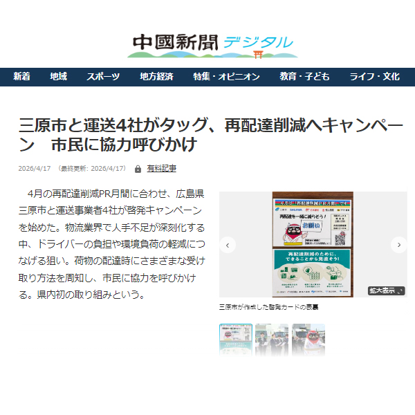 クリック>【中国新聞】三原市と運送4社がタッグ、再配達削減へキャンペーン 市民に協力呼びかけ(^O^)/